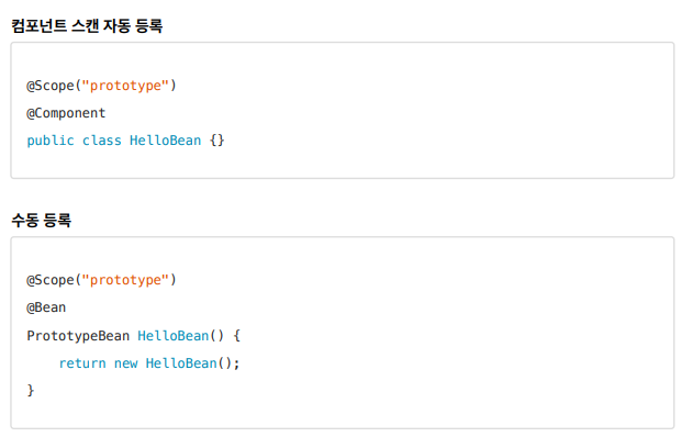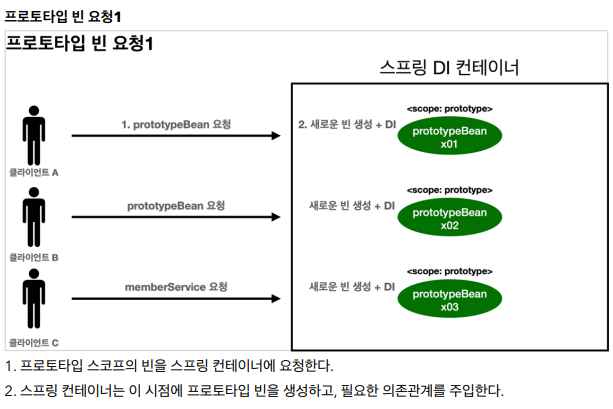 • 프로토타입: 스프링 컨테이너는 프로토타입 빈의 생성과 의존관계 주입까지만 관여하고 더는 관리하지 않는 매우 짧은 범위의 스코프이다.