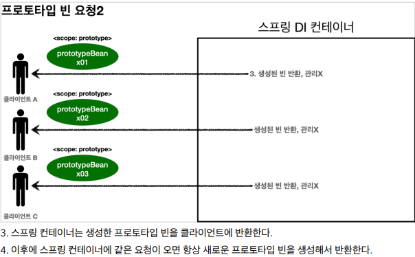 • 그래서 프로토타입 빈은 프로토타입 빈을 조회한 클라이언트가 관리해야 한다. 종료 메서드에 대한 호출도 클라이언트가 직접 해야 한다