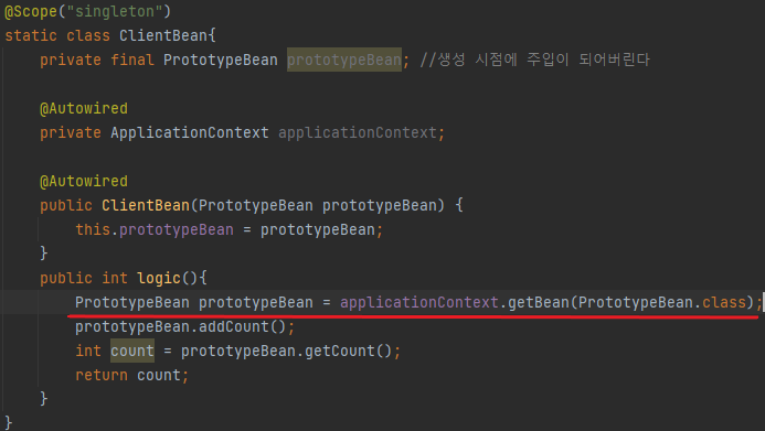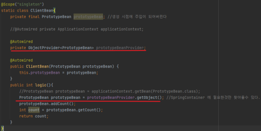 - 가장 간단한 방법은 싱글톤 빈이 프로토타입을 사용할 때 마다 스프링 컨테이너에 새로 요청하는 것이다.