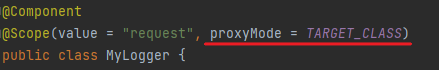 - 여기가 핵심이다. proxyMode = ScopedProxyMode.TARGET_CLASS를 추가해주자.