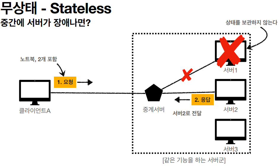 - 무상태(stateless) : 중간에 다른 점원으로 바뀌어도 된다.