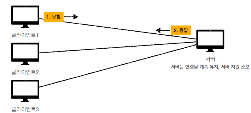 매번 요청마다 연결을 유지한다. - 연결을 유지하지 않는 모델