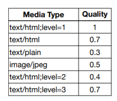 - Accept: text/*;q=0.3, text/html;q=0.7, text/html;level=1, text/html;level=2;q=0.4, */*;q=0.5