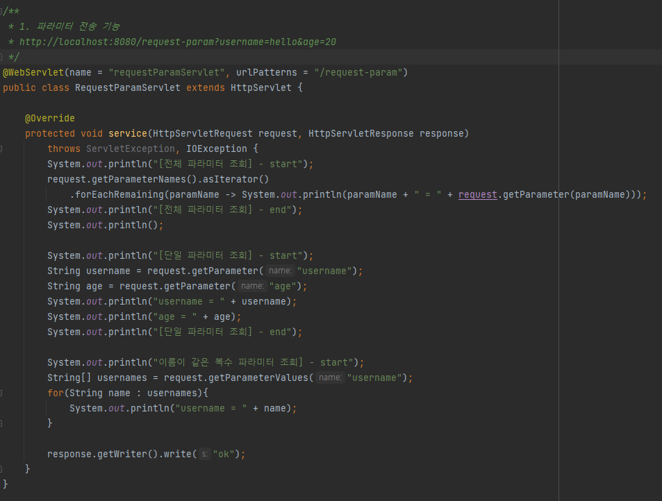 - getParameter("파라미터명")을 사용하여 단일 파라미터 조회 가능