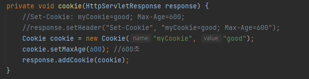 - 쿠키 객체를 생성해서 response 객체에 addCookie를 하게 되면 header에 쿠키가 세팅된다