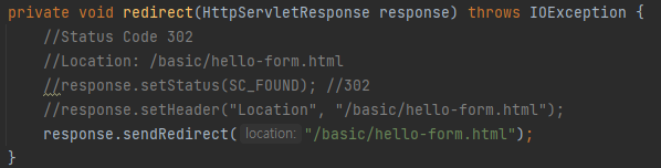 - response header에 302 코드오 Location을 채워서 반환해야 하지만, 편하게 sendRedirect 기능을 사용하면 된다.
