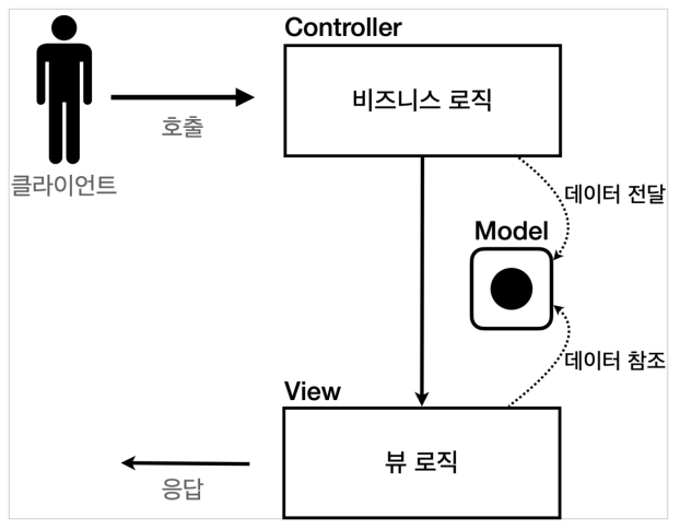 - 뷰: 모델에 담겨있는 데이터를 사용해서 화면을 그리는 일에 집중한다. 여기서는 HTML을 생성하는 부분을 말한다.