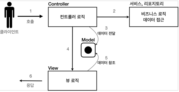 - 컨트롤러: HTTP 요청을 받아서 파라미터를 검증하고, 비즈니스 로직을 실행한다. 그리고 뷰에 전달할 결과 데이터를 조회해서 모델에 담는다.
