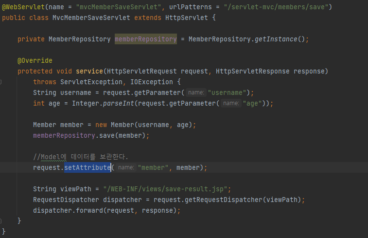 - Model은 HttpServletRequest 객체를 사용한다. request는 내부에 데이터 저장소를 가지고 있는데, request.setAttribute() , request.getAttribute()를 사용하면 데이터를 보관하고, 조회할 수 있다.