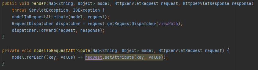 - JSP는 request.getAttribute() 로 데이터를 조회하기 때문에, 모델의 데이터를 꺼내서 request.setAttribute()로 담아둔다. JSP로 포워드 해서 JSP를 렌더링 한다.
