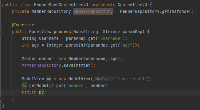 - HttpServletRequest가 제공하는 파라미터는 프론트 컨트롤러가 paramMap에 담아서 호출해주면 된다. 응답 결과로 뷰 이름과 뷰에 전달할 Model 데이터를 포함하는 ModelView 객체를 반환하면 된다.