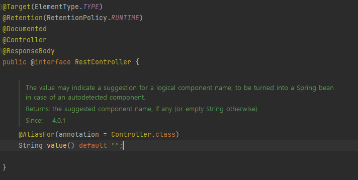 - 참고로 @ResponseBody는 클래스 레벨에 두면 전체에 메서드에 적용되는데, @RestController 에노테이션 안에 @ResponseBody 가 적용되어 있다.