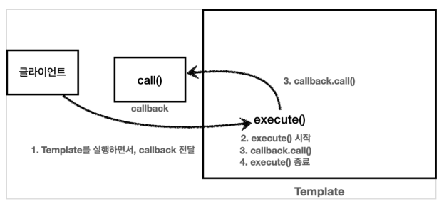- 스프링에서는 ContextV2와 같은 방식의 전략 패턴을 템플릿 콜백 패턴이라 한다. 전략 패턴에서 Context 가 템플릿 역할을 하고, Strategy 부분이 콜백으로 넘어온다 생각하면 된다.