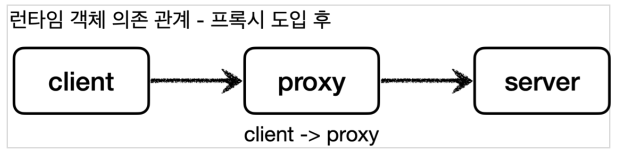 - 런타임(애플리케이션 실행 시점)에 클라이언트 객체에 DI를 사용해서 Client -> Server에서 Client -> Proxy로 객체 의존관계를 변경해도 클라이언트 코드를 전혀 변경하지 않아도 된다.