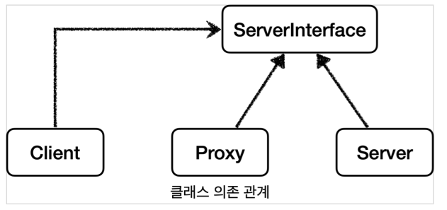 - 서버와 프록시는 같은 인터페이스를 사용해야 한다. 그리고 클라이언트가 사용하는 서버 객체를 프록시 객체로 변경해도 클라이언트 코드를 변경하지 않고 동작할 수 있어야 한다.