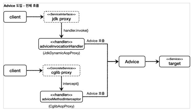 스프링은 이 문제를 해결하기 위해 부가 기능을 적용할 때 Advice라는 새로운 개념을 도입했다. 개발자는 InvocationHandler 나 MethodInterceptor를 신경 쓰지 않고, Advice 만 만들면 된다.