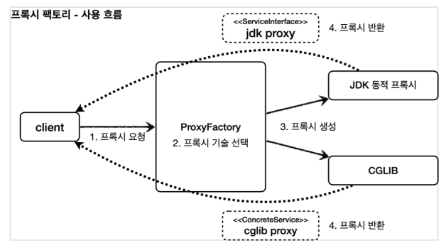 프록시 팩토리는 인터페이스가 있으면 JDK 동적 프록시를 사용하고, 구체 클래스만 있다면 CGLIB를 사용한다. 그리고 이 설정을 변경할 수도 있다.