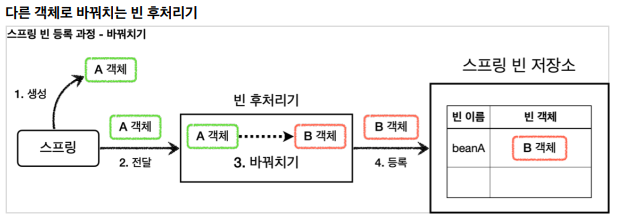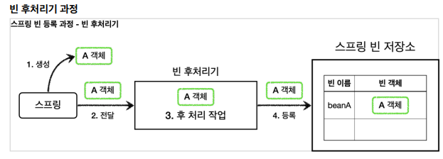 스프링이 빈 저장소에 등록할 목적으로 생성한 객체를 빈 저장소에 등록하기 직전에 조작하고 싶다면 빈 후처리기를 사용하면 된다.
