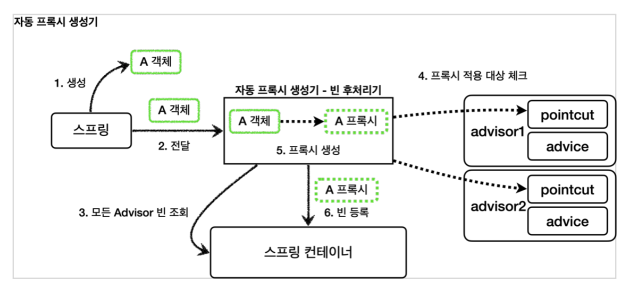 예를 들어서 어떤 스프링 빈이 advisor1 , advisor2 가 제공하는 포인트컷의 조건을 모두 만족하면 프록시 자동 생성기는 프록시를 몇 개 생성할까? 프록시 자동 생성기는 프록시를 하나만 생성한다. 왜냐하면 프록시 팩토리가 생성하는 프록시는 내부에 여러 advisor 들을 포함할 수 있기 때문이다. 따라서 프록시를 여러 개 생성해서 비용을 낭비할 이유가 없다.