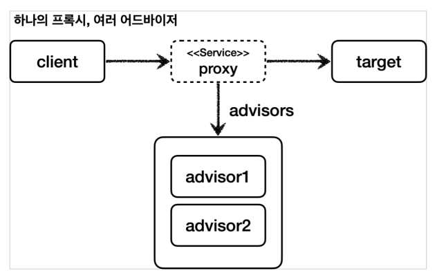 - advisor1 , advisor2 의 포인트컷을 모두 만족 -> 프록시1개 생성, 프록시에 advisor1 , advisor2 모두 포함