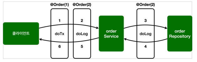 • 하나의 애스펙트 안에 있던 어드바이스를 LogAspect , TxAspect 애스펙트로 각각 분리했다. 그리고 각 애스펙트에 @Order 애노테이션을 통해 실행 순서를 적용했다. 참고로 숫자가 작을 수록 먼저 실행된다.
