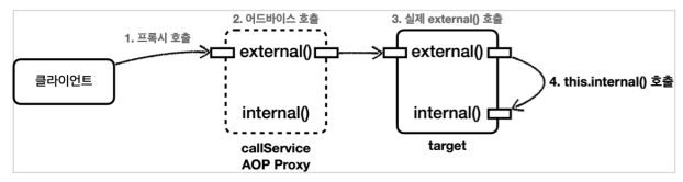 - 자바 언어에서 메서드 앞에 별도의 참조가 없으면 this라는 뜻으로 자기 자신의 인스턴스를 가리킨다. 결과적으로 자기 자신의 내부 메서드를 호출하는 this.internal() 이 되는데, 여기서 this는 실제 대상 객체(target)의 인스턴스를 뜻한다. 결과적으로 이러한 내부 호출은 프록시를 거치지 않는다. 따라서 어드바이스도 적용할 수 없다