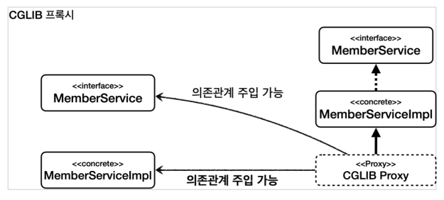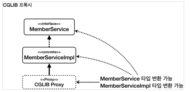 - CGLIB는 구체 클래스를 기반으로 프록시를 생성한다. 따라서 CGLIB는 MemberServiceImpl 구체 클래스를 기반으로 프록시를 생성한다