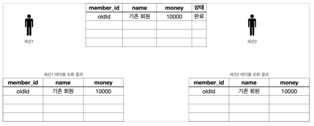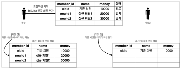 - 데이터를 넣은 세션 1에서는 값이 보이지만 데이터를 넣지 않은 세션2 입장에서는 커밋되지 않은 데이터이기에 데이터가 보이지 않는다.