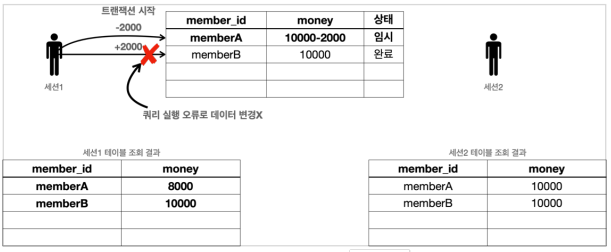 - 계좌이체를 실행하는 도중에 SQL에 문제가 발생한다. 그래서 memberA 의 돈을 2000원 줄이는 것에는 성공했지만, memberB의 돈을 2000원 증가시키는 것에 실패한다.
