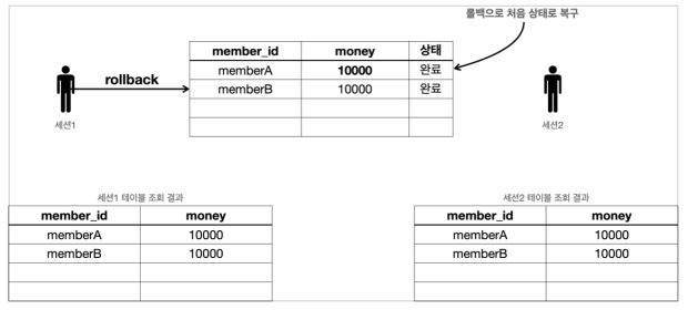 - 롤백을 사용한 덕분에 계좌이체를 실행하기 전 상태로 돌아왔다. memberA 의 돈도 이전 상태인 10000 원으로 돌아오고, memberB의 돈도 10000 원으로 유지되는 것을 확인할 수 있다.