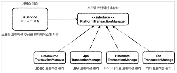 - 서비스는 특정 트랜잭션 기술에 직접 의존하는 것이 아니라, TxManager라는 추상화된 인터페이스에 의존한다. 이제 원하는 구현체를 DI를 통해서 주입하면 된다. 예를 들어서 JDBC 트랜잭션 기능이 필요하면 JdbcTxManager를 서비스에 주입하고, JPA 트랜잭션 기능으로 변경해야 하면 JpaTxManager를 주입하면 된다.