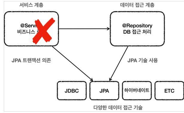 - 트랜잭션을 사용하는 코드는 데이터 접근 기술마다 다르다. 만약 다음 그림과 같이 JDBC 기술을 사용하고, JDBC 트랜잭션에 의존하다가 JPA 기술로 변경하게 되면 서비스 계층의 트랜잭션을 처리하는 코드도 모두 함께 변경해야 한다.